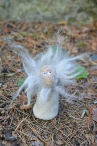Du kan ta med egen tvättad och kardad ull. Då behöver du en grövre ofärgad ull till stoppning, färg till kroppen, färg till huvud och näsa, lite vitt och svart till ögon samt lockar eller tops till hår.