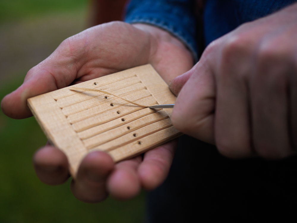 Lär dig tälja en bandgrind av fin utkluven björk. Med en kortbladig kniv täljer vi fram en bandgrind för lite smalare band.